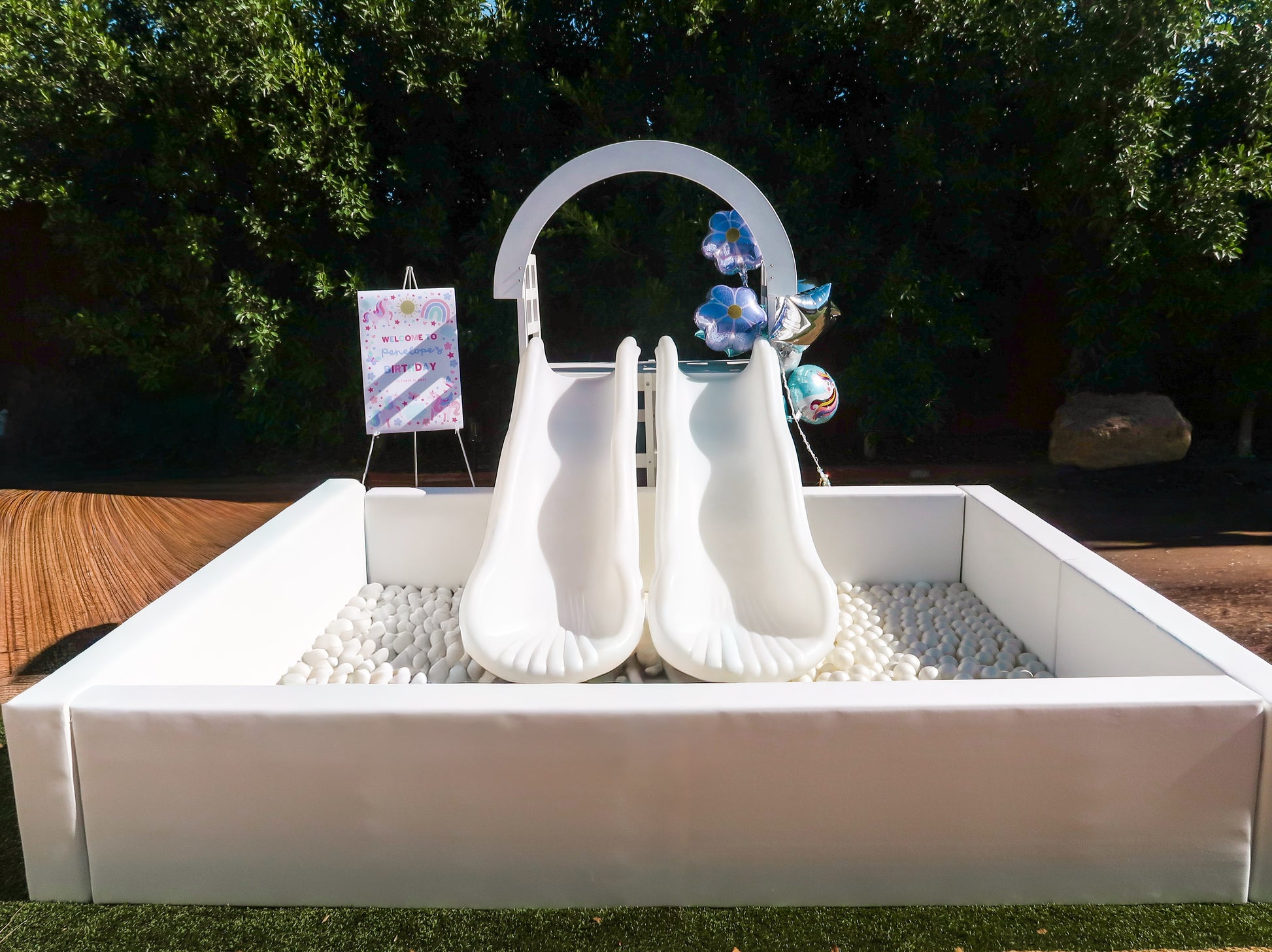 Immerse your little guests in pure magic with the Calabasas Bounce House Ball Pit — a crowd-pleaser that promises unforgettable moments! Dive into a sea of premium, BPA-free balls. Take the excitement to the next level with TWO 6-foot slides, offering a smooth ride into an ocean of fun. Make waves of memories with this must-have addition to your celebration!